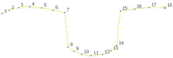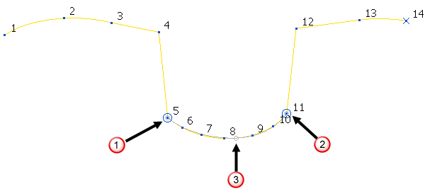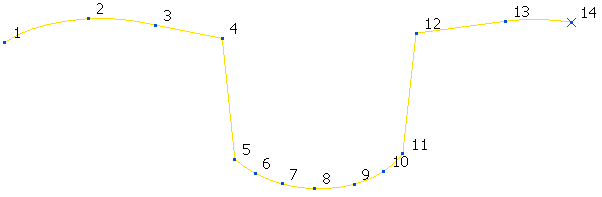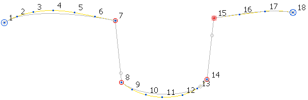 “范围内的点数”不包括此处选择的任意点。因此,如果有 4 个忽略点且“范围内的点数”为 10,则最终曲线中将有 14 个点。开始点、结束点和 4 个忽略点的位置保持不变且切线方向与之前相同,8 个剩余点在开始点和结束点之间以等距离间隔分布。