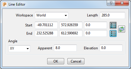 - 工作空间 - 此选可在世界坐标系、工作平面或相对于工作空间中编辑直线。在相对于工作空间中,原点位于直线的开始点,其轴与当前工作空间对齐