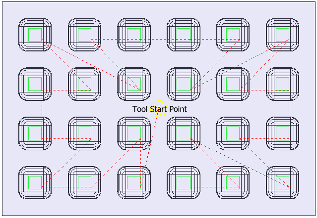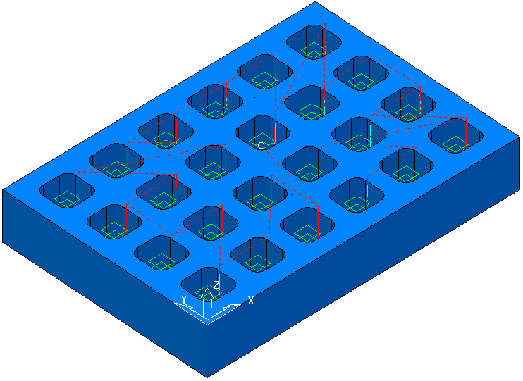 本例基于首先沿 X 轴方向,然后沿 Y 轴方向单向加工的示例并按径向刀具路径顺序创建刀具路径。这将计算刀具自刀具开始点的径向移动,并在与径向路径相遇时转而加工型腔。