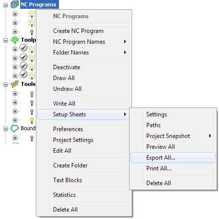 1. 从“NC 程序”关联菜单中选择“设置清单”>“输出所有”。