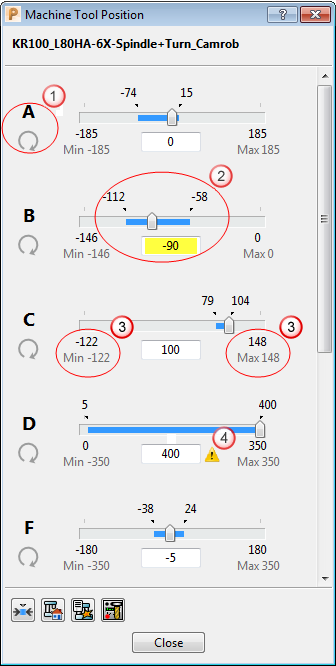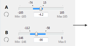拖动拇指滑块 以微调轴。值 -90 是轴的当前位置。蓝色线以及值 -112-58 表示在当前仿真运行状态中已将轴微调到的最远点。