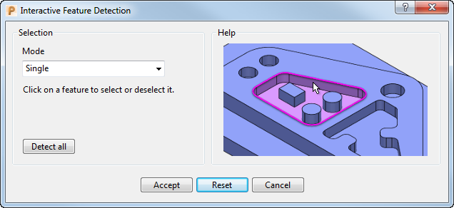 您可以使用“交互特征探测”对话框,基于模型几何形体轻松探测和创建特征。如果您要扫描模型以探测具有相似几何形体的所有特征,然后再创建这些特征,这非常有用。