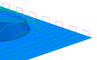 - 刀具路径点 - 测量下切移动和斜向切入相对于刀具路径段始端(当前 Z 高度)的相对距离。“距离”为 2 时的效果: