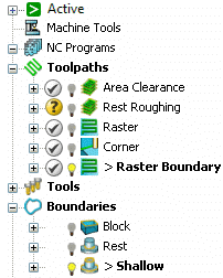 本例使用一个毛坯以及一些刀具、刀具路径和边界,并且可将某些刀具路径限制在边界内。