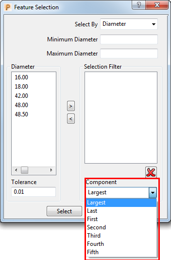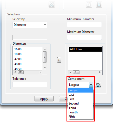 使用“部件”按照特定孔部件的直径或长度来选择孔。这将选择整个孔(不只是孔部件)。