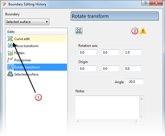 - 如果系统显示此图标,则表示边界历史包含一项或多项选择了曲线段或点的编辑。如果“编辑”列表包含一项或多项这些选择性的编辑,则单击“计算”只会重新计算直至第一次需要进行选择的编辑为止的边界,并会删除所有后续的编辑。