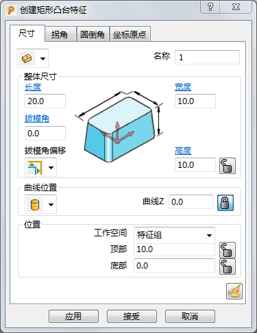 底部 - 在特征底部设置轮廓曲线。曲线 Z - 输入值以指定轮廓曲线沿 Z 轴的高度。如果指定了“拔模角”,则系统会通过从此高度偏移曲线来应用拔模角。