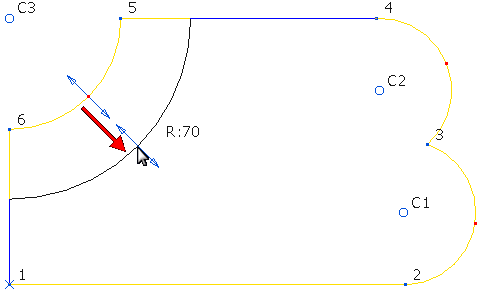 圆弧的中心点保持不变。圆弧的半径会更改,且系统会重新裁剪连接到圆弧的直线。