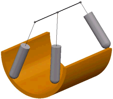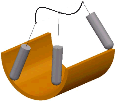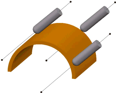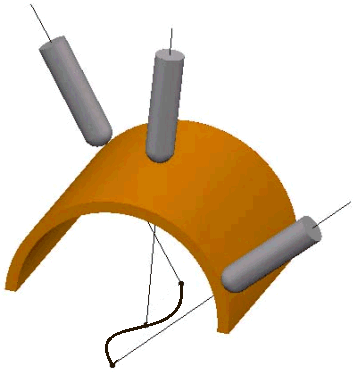 - 朝向曲线 - 选择此项时,刀尖尝试指向固定曲线。曲线必须是具有单个段的参考线(可在“参考线”域中选择)。刀具角度会不断变化。机床主轴头会大幅移动,而刀尖保持相对静止。此选项可使刀尖朝向某条曲线。