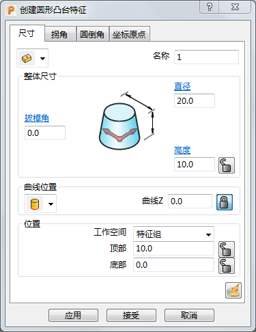 曲线 Z - 输入值以指定轮廓曲线沿 Z 轴的高度。如果指定了“拔模角”,则系统会通过从此高度偏移曲线来应用拔模角。