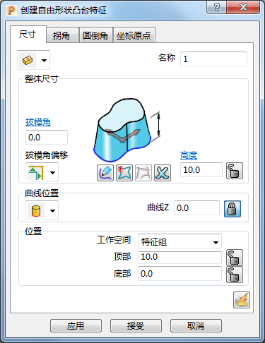 曲线 Z - 输入值以指定轮廓曲线沿 Z 轴的高度。如果指定了“拔模角”,则系统会通过从此高度偏移曲线来应用拔模角。
