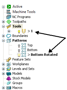 在本例中,“刀具”和“参考线”条目处于展开状态,因为存在激活刀具 (1) 和激活参考线(“Bottom Rotated”)。“刀具路径”、“边界”、“工作平面”、“层和组合”和“模型”条目未展开,因为尽管它们包含条目,但却未激活。