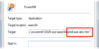 如果需要,可以将 .html 文件放在任何其他目录。如果是这样,则在“目标”域中输入完整路径名。例如,…\pmill.exe D:\MyHTML\abc.htm。