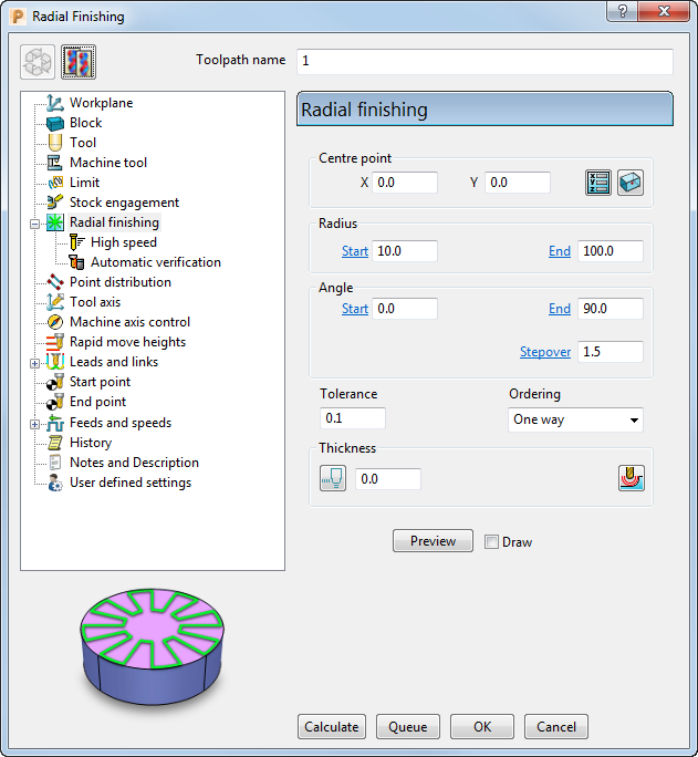使用“放射精加工”策略可在边界内创建 2D 放射参考线,然后再将其投影到模型上。然后再加工此参考线。