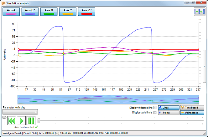 “仿真分析”插件是一种高效的工具,可识别旋转轴的不必要移动,因为它能通过折线图的形式表示机床轴的移动。在下方的图形中,C(旋转)轴(以紫色显示)在 1 秒的时间内,从大约 85