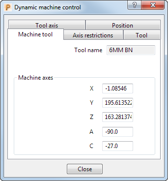 “动态加工控制”模式对话框上的“机床”选项卡显示各机床轴的位置。在您使用抓手调整机床轴位置时该值会自动更新。