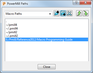 要添加新的宏搜索路径,请从“宏”菜单中选择“宏路径”选项。系统此时将显示“PowerMill 路径”对话框。