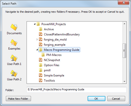 移动到适当的目录(如适用,使用“新建文件夹”按钮)。路径名称会显示在对话框底部(本例中为 E:\Pmill\Reference2012\Macro Programming Guide)。单击“确定”。