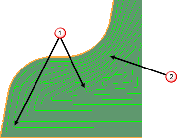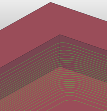赛车线光顺 - 选择此项可防止刀具路径中的尖锐拐角造成的机床受力突然改变,从而将标准偏移替换为可实现更高进给率的偏移。此偏移会用圆角替换尖角,并将行距从固定距离更改为可变距离。使用滑块可指定与指定行距的最大偏移百分比。