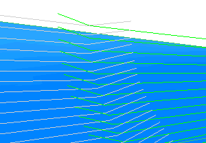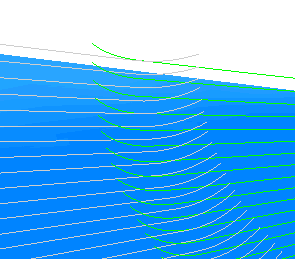 使用“刀具路径提刀”对话框可避免这类不匹配情况。通过该对话框,您可以在刀具靠近路径末端时逐步从切削区域中退刀。实际上,每条路径的最后一部分都应该替换为一个沿接触点法线提刀,同时遵照基本刀具方向并保持刀轴的斜向。这是斜向的一种类型,但这种斜向会替换刀具路径部分,并朝向同一方向,而不是在末端固定并回溯。