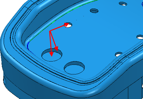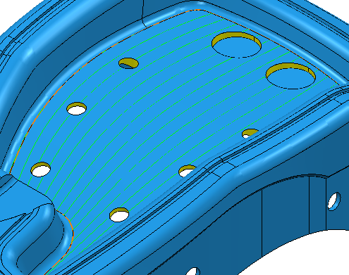 但是,如果您现在尝试“计算”此刀具路径,将无法获得所需的刀具路径。PowerMill 会在此参考线内部的所有曲面创建刀具路径。因此,系统也会将孔中的曲面考虑在内。