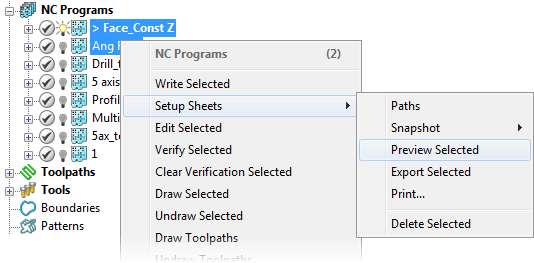 1. 选择所需的 NC 程序,然后从关联菜单中选择“设置清单”>“预览已选”。