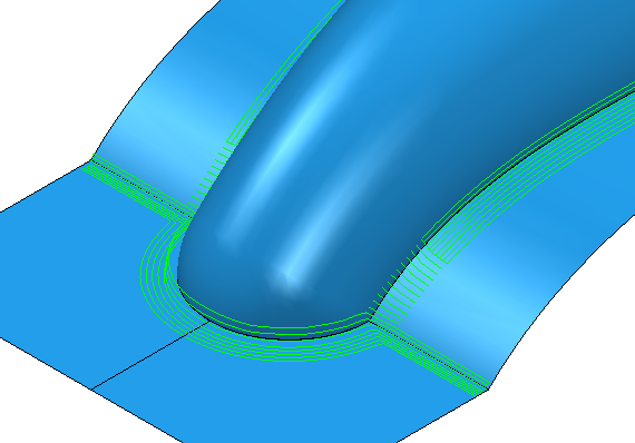 清角刀具路径会沿着浅滩区域的拐角轮廓并缝合陡峭区域。以下几个页面与“清角精加工”策略有关: