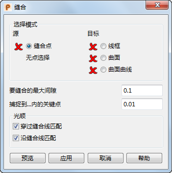 光顺 - 使用这些选项可以通过缝合线将源曲面光顺连接到目标曲面或曲面曲线,源曲面的已选曲线将在此与目标相交。
