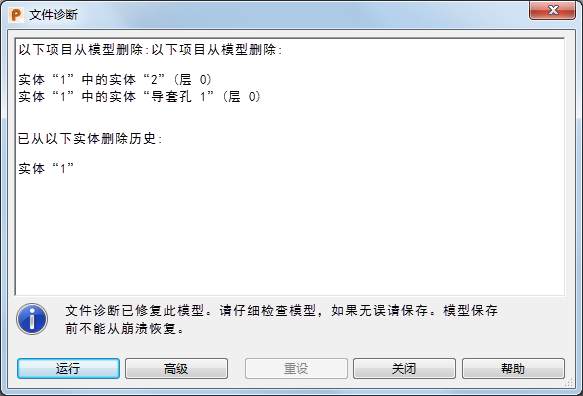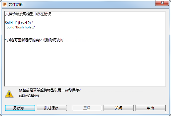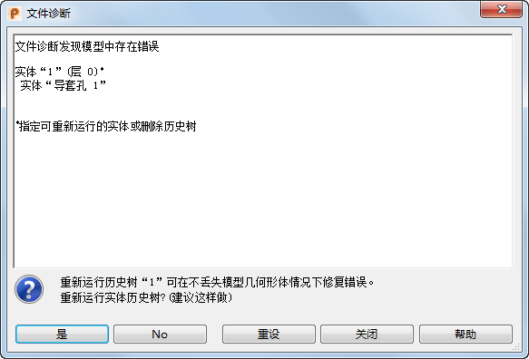 文件诊断提供的修复类型取决于模型中检测到的错误。文件诊断会尽可能提供不删除模型几何形体的修复,例如重新运行或删除实体历史树。