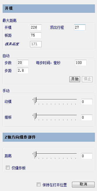 保持在开放位置 - 单击“关闭”时,模具保留打开状态,而不管当前设置的距离为何。这对于在开模底座上生成绘图很有用。