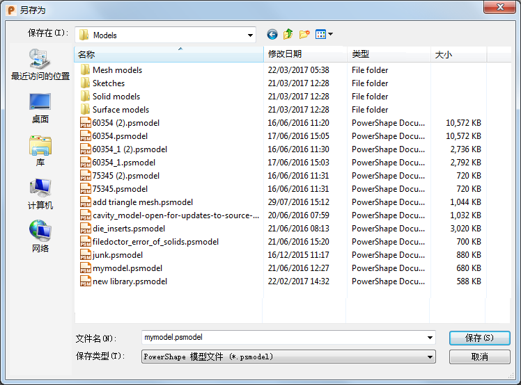 如果将文件输入新模型中,则进行保存时,上次输入的文件的名称将用作模型名称。例如,如果上次输入的文件的名称为 handle.igs,则模型名称为“handle”。