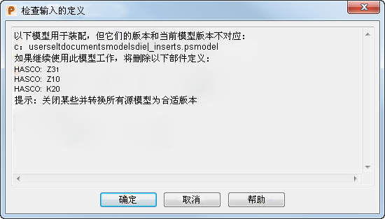 当您打开包含部件定义的模型时,如果创建源模型时使用的 PowerShape 版本与当前程序具有不同的模型版本号,将显示“检查输入的定义”对话框。此对话框将列出:
