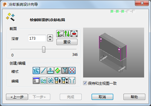 此“冷却向导”页面用于输入和编辑冷却流道的布局。