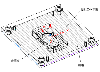 程序将在模具板块(表示孔将位于的平面)内绘制并拟合栅格。在模具板块周围边界框的中心,将创建一个临时工作平面,以提供从中创建孔的坐标原点。还会绘制一个参考点。默认情况下,它会接触模具板块周围边界框的底部平面,并位于临时工作平面原点的正下方。