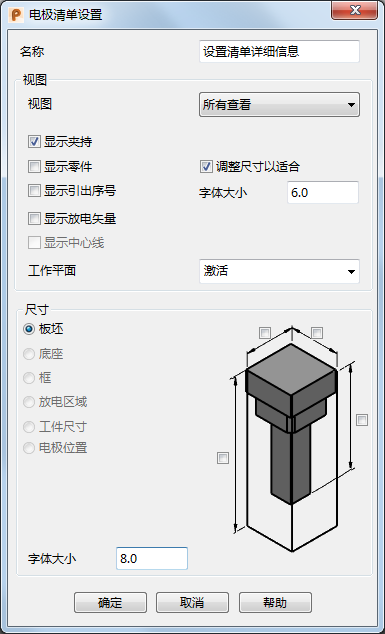 注: 当您更新 PowerShape 的版本时,默认的电极设置清单模板会自动更新。但是,如果您之前曾自定义此设置表单,则安装新版本的 PowerShape 将不会覆盖该自定义的版本。