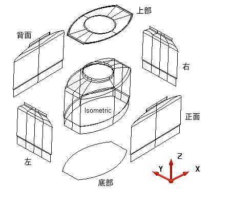 方向 - 使用此选项可指定模型视图相对于由“相对于”下拉列表所定义工作空间的方向。每个方向如下图所示: