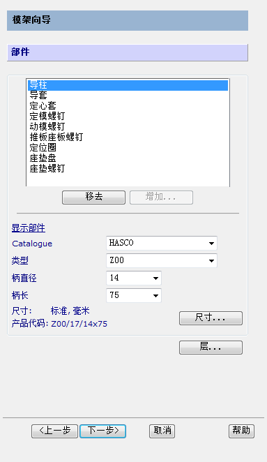 向导将搜索部件目录以查找长度和直径与选择的模架大小和板厚度匹配的支承柱、导套、司筒和螺钉。