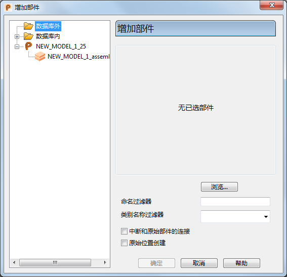 使用此对话框可以向装配增加选定部件。对话框左侧窗格中的树代表已打开的装配模型和当前的工作模型。