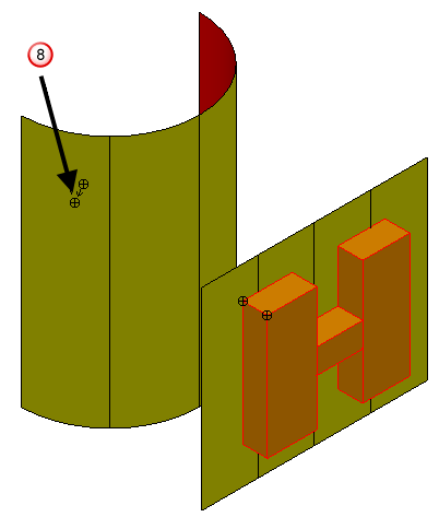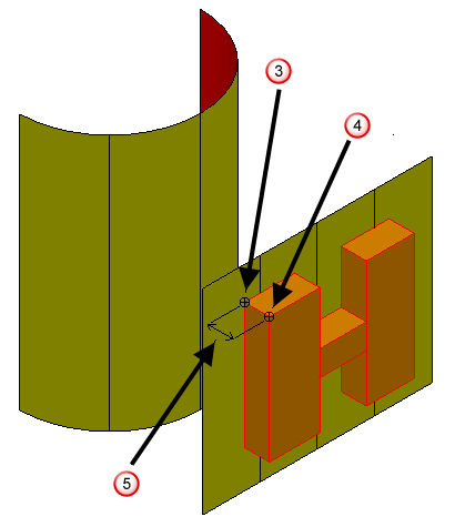 挤出的 H 曲面因平面参考曲面和圆柱控制曲面之间的差异而摹仿变形。参考曲面上的每个点在控制曲面上均存在一个具有相同二维参数化坐标的对应点。这用于定义如何重塑 H。
