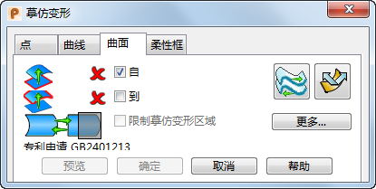 使用“摹仿变形”对话框的“曲面”选项卡选择曲线,然后指定摹仿变形: