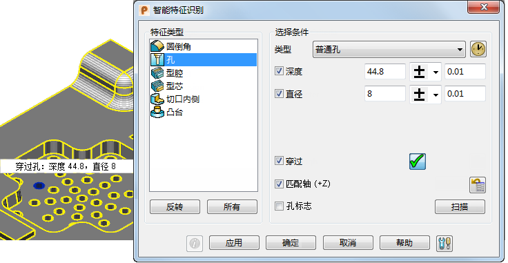 2. 单击“实体”选项卡 >“特征”面板 >“智能识别”,以显示“智能特征识别”对话框。