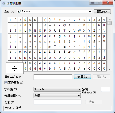“字符映射”对话框的右下角将显示字符值 (Keystroke),在本例中其值为 Alt+0247。