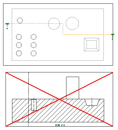 剖视图上将显示一个红十字叉,表示视图因剖面线已更改而过期。