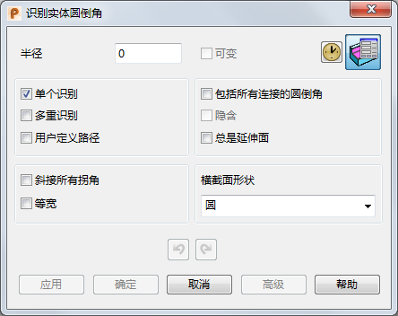 3. 单击“圆倒角”对话框上的“编辑模式” 按钮以显示“识别实体圆倒角”对话框: