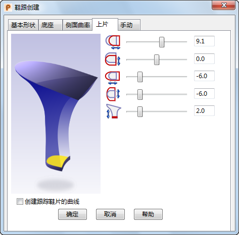 使用“上片”选项卡可定义在创建鞋跟上片时要使用的参数。