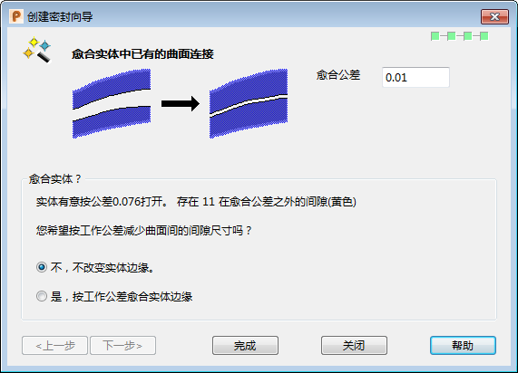 是,按工作公差愈合实体边缘 - 尝试通过操作曲面边界降低连接实体边缘间的间隙。