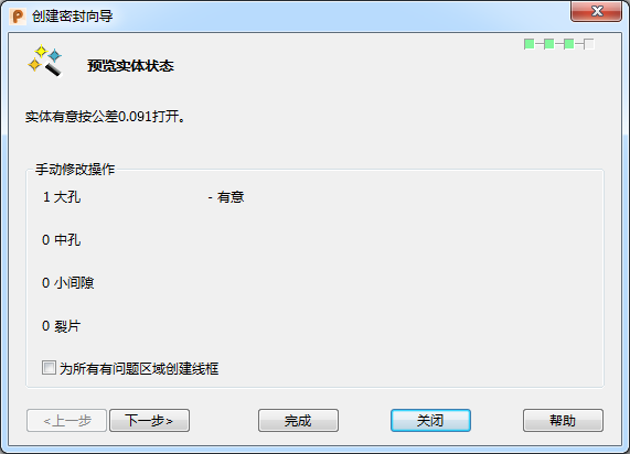 在警告对话框中单击“确定”后,您将返回向导,以便更改愈合公差。再次选择“完成”将再显示一条警告消息(愈合过程仍然无法愈合为指定的公差),或显示“创建密封向导结果”页面。