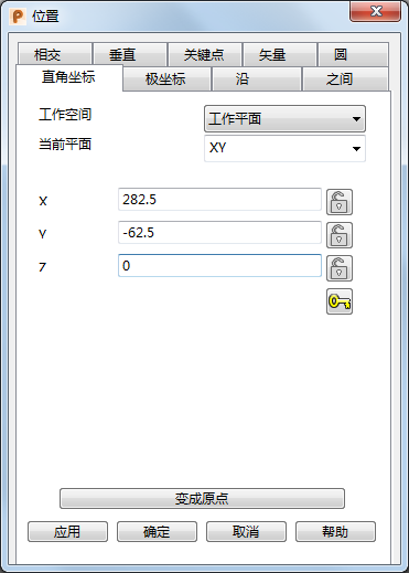 如果使用光标无法输入位置(X、Y 和 Z 轴的值),可以使用“位置”对话框来帮助您处理更复杂的构造。例如,您可以使用它按照指定的比例沿对象指定点。