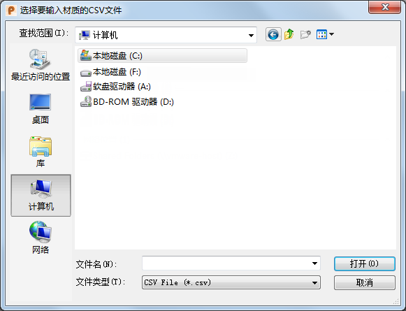 使用此对话框选择 .csv 文件以将材质数据输入到数据库。