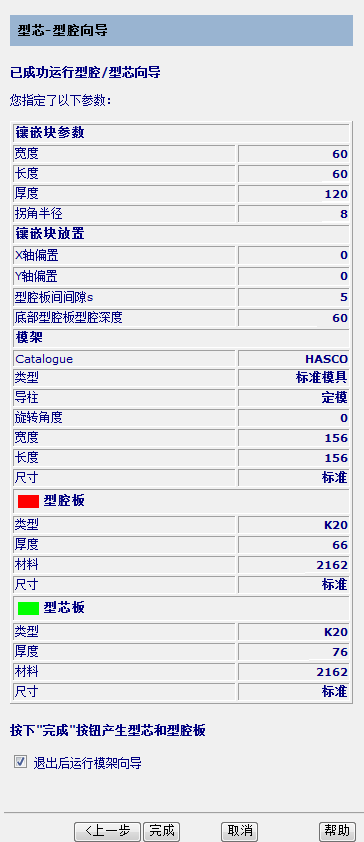 使用此页面可以查看参数,然后创建型腔和型芯板。